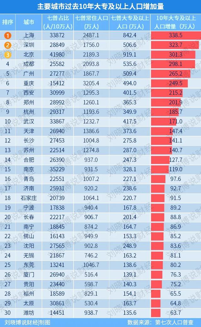 但2010年以后,情况发生了权贵变化。从第六次东说念主口普查到第七次东说念主口普查,深圳大专及以上东说念主口增长了323.7万东说念主,仅次于上海位居宇宙第二。