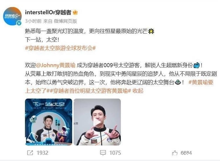谁能意料,银幕上长年扮演铁血军东谈主、缉毒刑警的黄景瑜,此次竟真砸下300万元巨资,锁定一张通往近地轨谈的专属船票,讲求迈入天际旅行者行列。